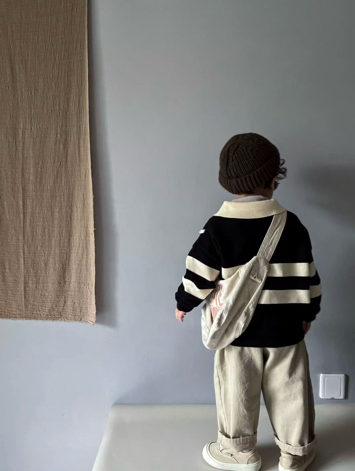Elevate your little one's wardrobe with this stylish and cozy Classic Striped Knit Polo Sweater. Designed with a timeless polo collar and button-up front, this sweater blends comfort with a preppy aesthetic. The soft knit fabric ensures warmth and breathability, making it perfect for everyday wear or special outings. Available in two versatile color combinations – beige with black stripes and black with beige stripes – this sweater pairs effortlessly with jeans, skirts, or trousers for a polished yet relaxed look. Ideal for chilly days, this must-have piece adds a sophisticated touch to any child's wardrobe.